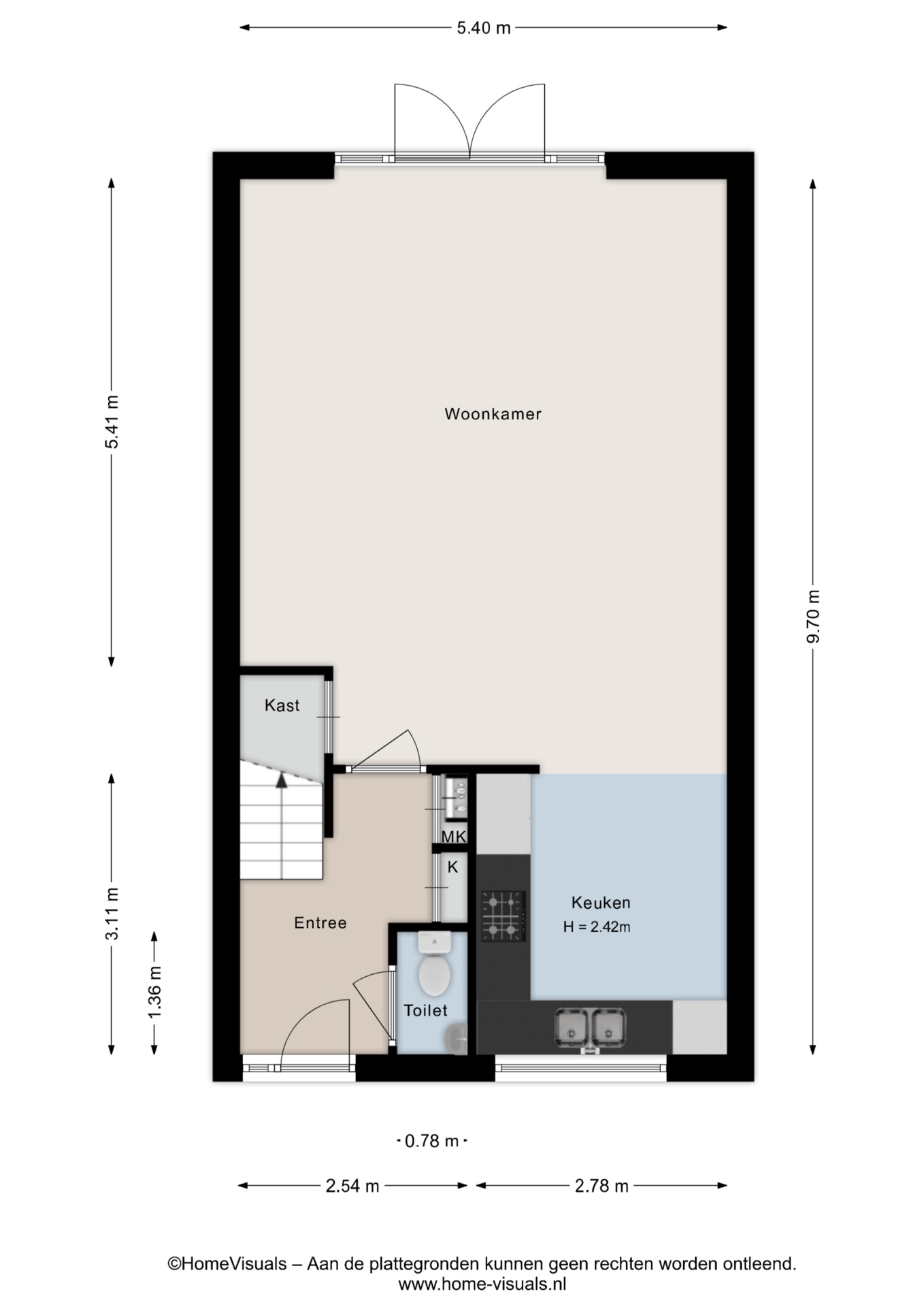 Bij binnenkomst via de entree kom je in de hal met meterkast, vaste kast en een toilet met wastafel. Vanuit hier stap je de leefruimte in, waar direct de fijne indeling opvalt. De straatgerichte open keuken is praktisch en hedendaags ingericht en in de afgelopen jaren deels vernieuwd. Klaar voor jarenlang kookplezier.