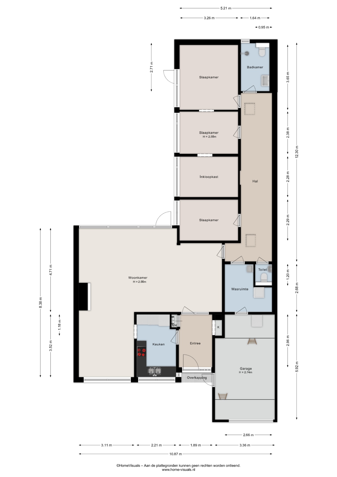 Aansluitend vind je een tussenhal met toegang tot de bijkeuken, voorzien van uitstortgootsteen, witgoedaansluitingen en de CV-opstelling. Vanuit hier is ook de garage bereikbaar. Een extra hal met lichtkoepels verbindt de overige ruimtes op een prettige manier.