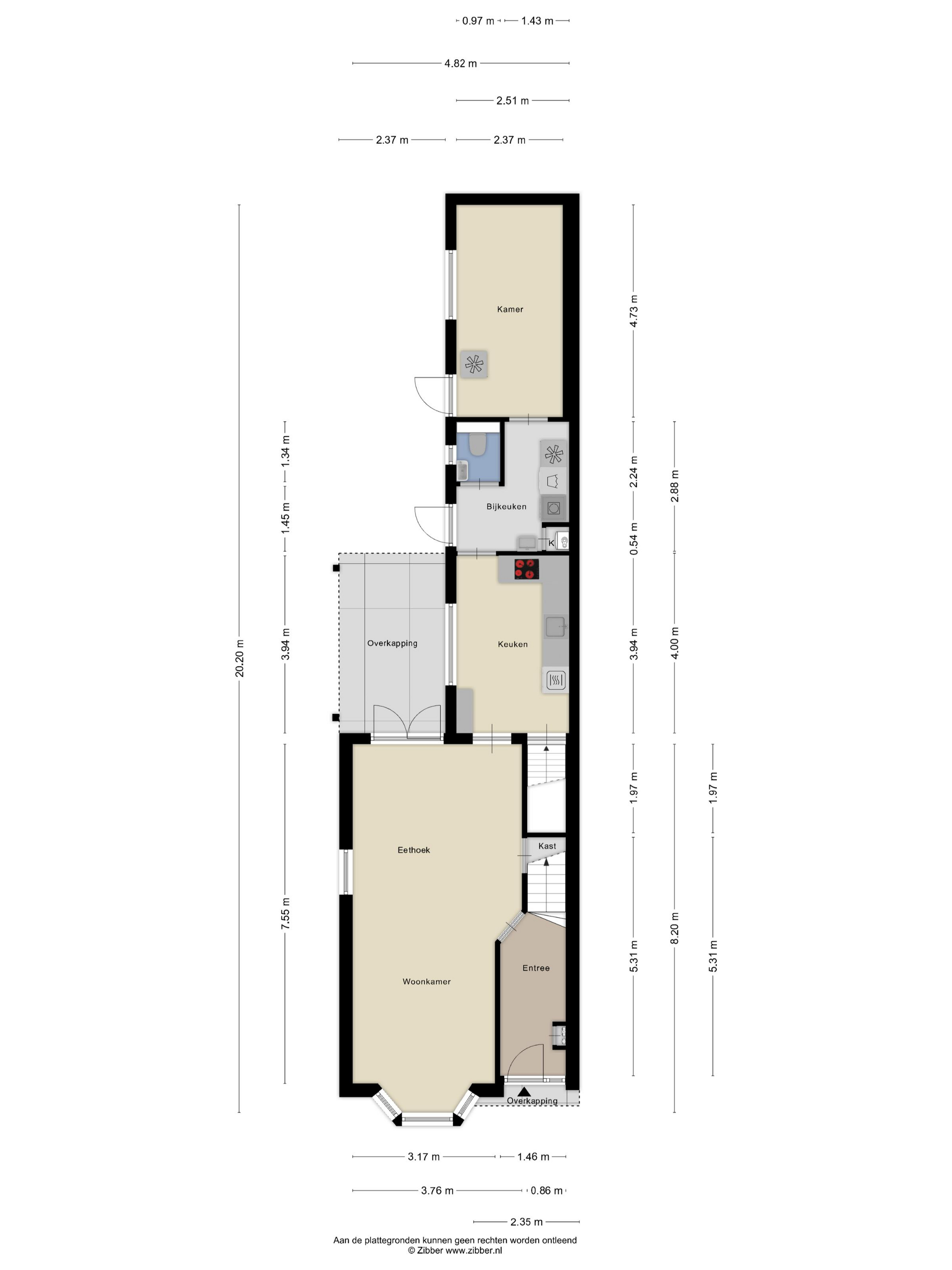 Begane grond: entree door de nieuwe voordeur, hal met trapopgang, meterkast, woonkamer met tuindeuren naar de tuin, parketvloer en toegang tot de trapkast, dichte keuken voorzien van een moderne inbouwkeuken met diverse apparatuur, bijkeuken met de wasmachine aansluiting, separaat toilet en (werk)kamer voorzien van airco en vloerverwarming.